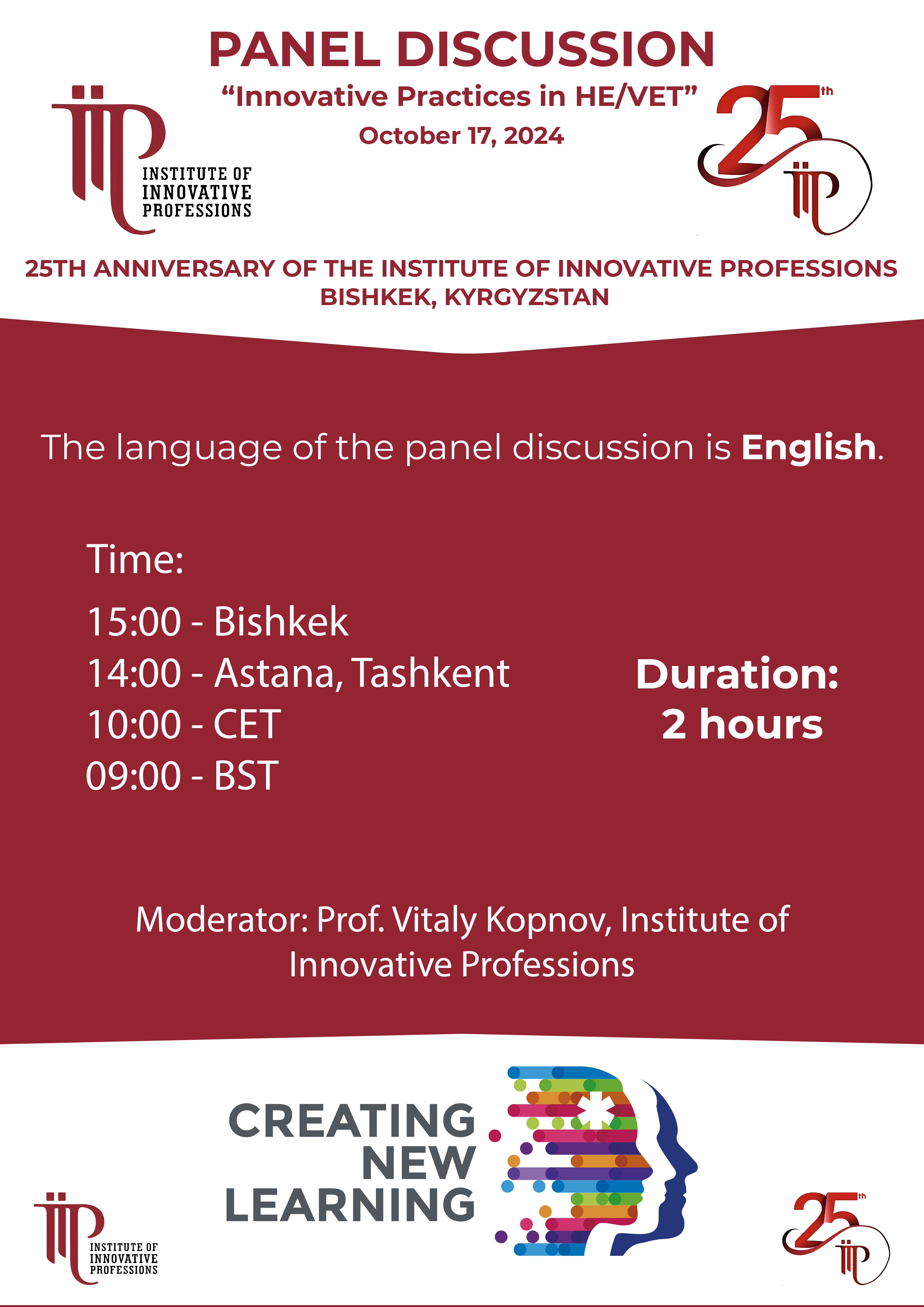 We invite you to register for the panel discussion ‘Innovative Practices in HE/VET’, which will be held on October 17, online in the framework of the Jubilee International Conference ‘The Problem of Sustainability in the Era of Uncertainty: Education and Science’, dedicated to the 25th anniversary of the Institute of Innovative Professions, Bishkek, Kyrgyzstan.