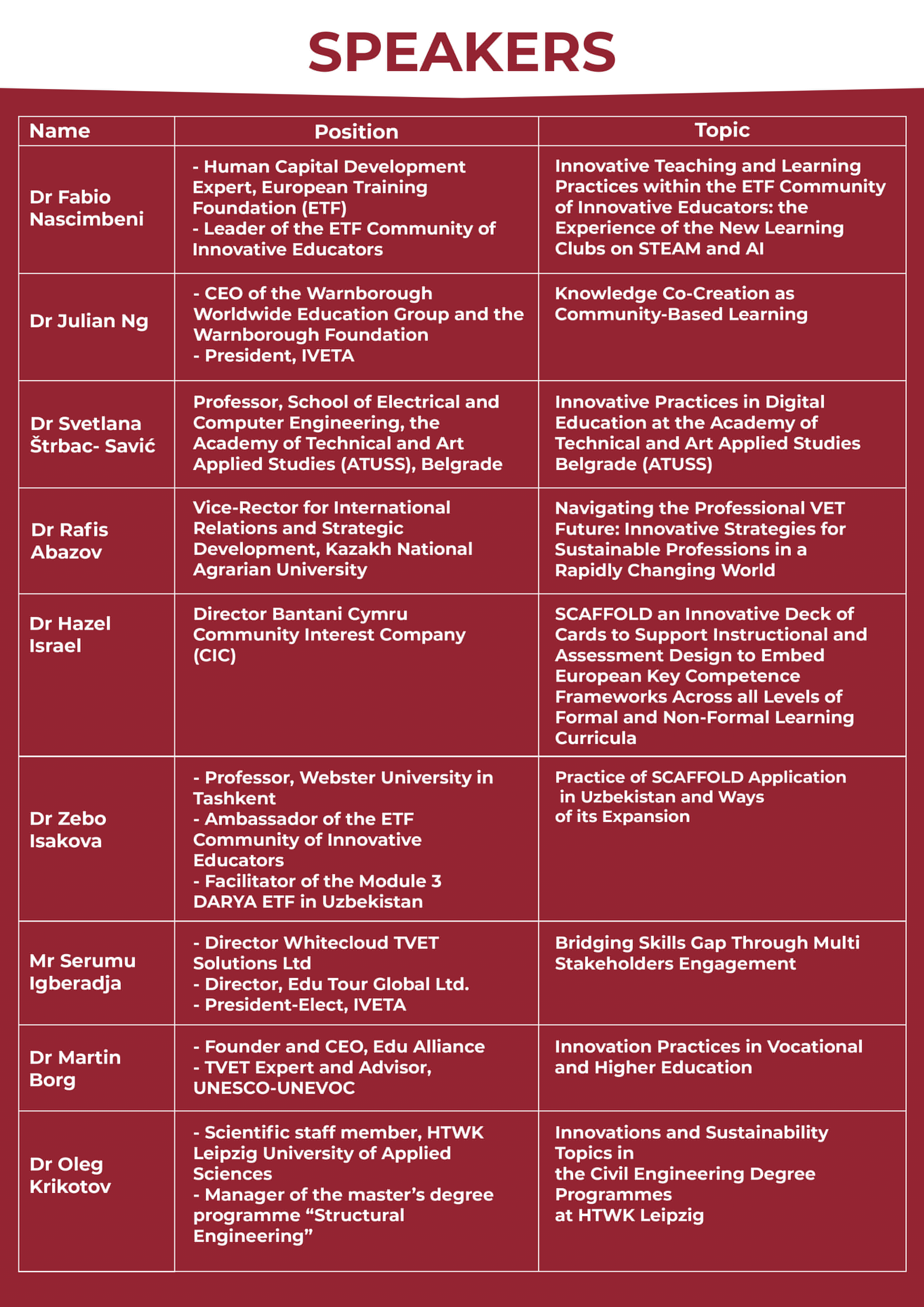 В рамках панельной дискуссии известные спикеры в области инновационных подходов в образовании представят всесторонний обзор инновационных подходов к преподаванию и обучению с особым акцентом на STEM-образовании, цифровой грамотности, устойчивом развитии, Европейских рамках компетенций, технологии SCAFFOLD и многое другое.