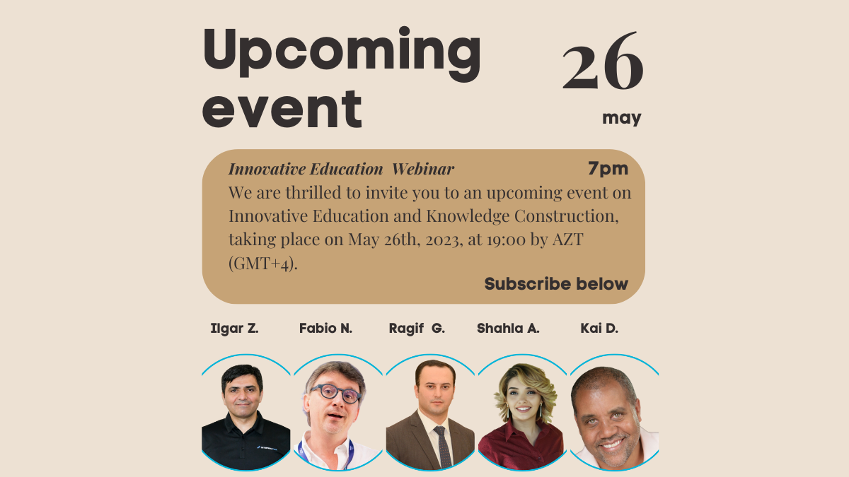 We are thrilled to invite you to an upcoming event on Innovative Education and Knowledge Construction, taking place on May 26th, 2023, at 19:00 by AZT (GMT+4). This event promises to be a great opportunity for learners of all levels to expand their knowledge and engage with cutting-edge ideas in the field of education.