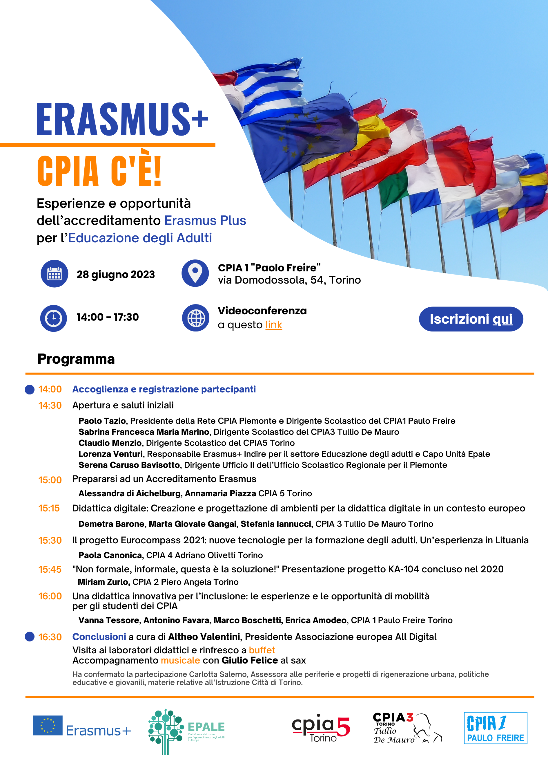 Erasmus+ and the future of Adult Education in CPIA -(State schools for adult education in Italy) Turin June 28th at CPIA1 Paulo Freire via Domodossola, 54 (metro Rivoli) 14.00 - 17.30 Registration here: https://forms.gle/cCitWRkRbBZFS77a8 To follow the meeting online click here: https://meet.jit.si/Erasmus_CPIA_Torino_disseminazione_2