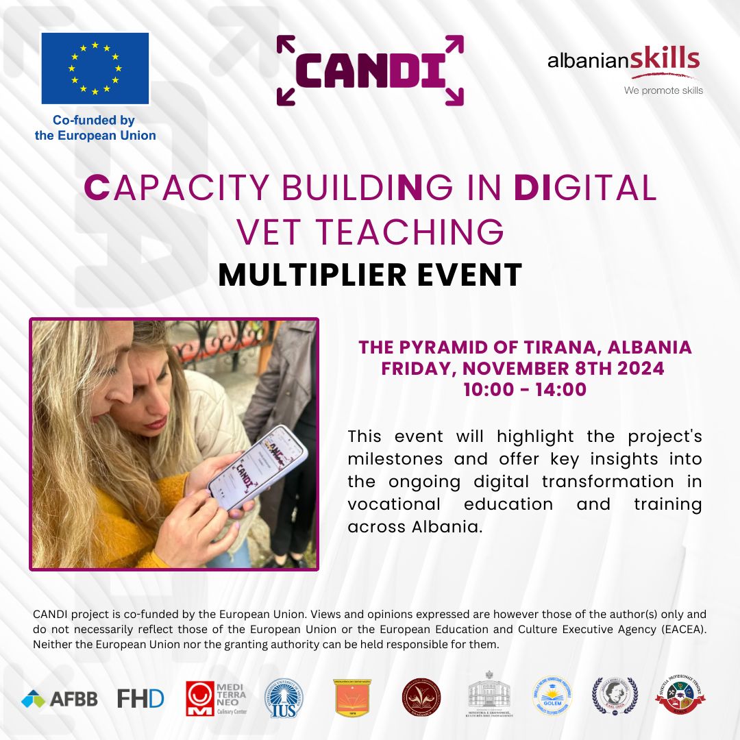 We are pleased to invite you to the multiplier event of our Erasmus+ project, CANDI. This event aims to showcase the project’s achievements and share valuable insights into the digital transformation of vocational education and training in Albania.
